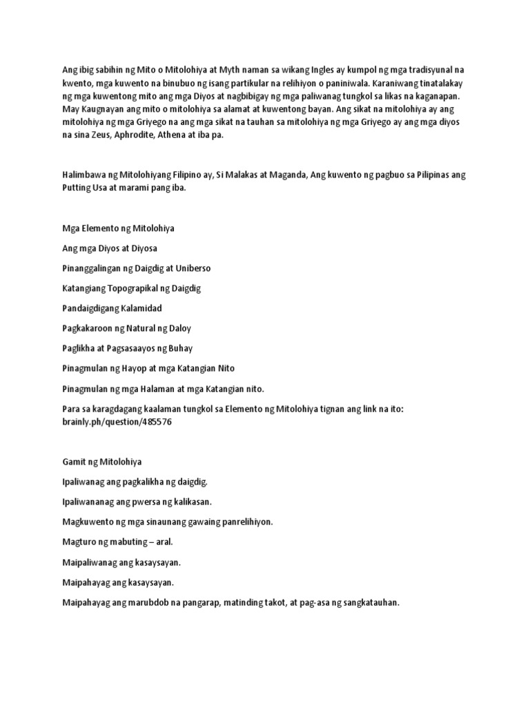FILIPINO Mitolohiya o Agham o pag-aaral ng mga mito myth at alamat Mito Myth o Latin mythos mula sa Greek na muthos kwento o muthos mu paglikha ng tunog sa bibig Gamit ng Mitolohiya o Ipaliwanag ang pagkakalikha ng daigdig o Ipaliwanag ang pwersa ng kalikasan o Maikwento ang mga sinaunang. Maipahayag ang marubdob na pangarap matinding takot at pag-asa ng sangkatauhan. Ang alamat ng paglikha mito ng paglikha o kuwento ng paglikha ay isang masagisag na pagsasalaysay ng kung paanong nagsimula ang mundo at kung paanong ang tao ay unang dumating upang manirahan sa daigdig.