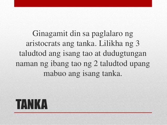 Human translations with examples. Katulad lamang ng Haiku ang Tanka ay mahalagang parte ng tradisyon at kultura ng mga hapon. TANKA Sa paksang ito ating tatalakayin ang mga halimbawa ng payak na tanka tungkol sa pagsubok.