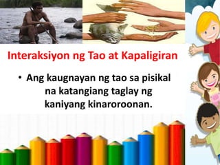 Dito ibinase nila sa criteria. Isyung may kinalaman sa kalikasan at paano ito naaapektuhan ng mga gawain ng tao. Kilos ngTao act of man Ang kilos ng tao act of man ay mga kilos na nagaganap sa tao.