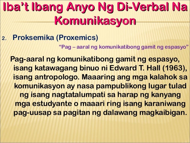 Di berbal na Komunikasyon. Magandang pagkakataon ding magkaroon ng mayamang kaalaman sa istatus ng wikang Filipino bilang asignatura at midyum ng komunikasyon sa labas ng ating bansa at harapin kung anong adbokasi ang maisusulong upang mabigyang puwang ito sa pag-aaral at pagpapayaman ng kultura. Ayon sa kaniya ang wika ay nangangahulugan ng.
